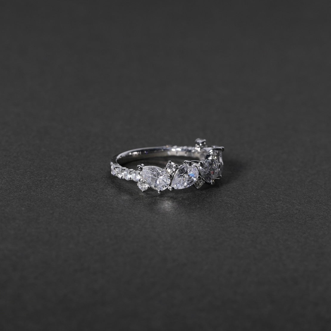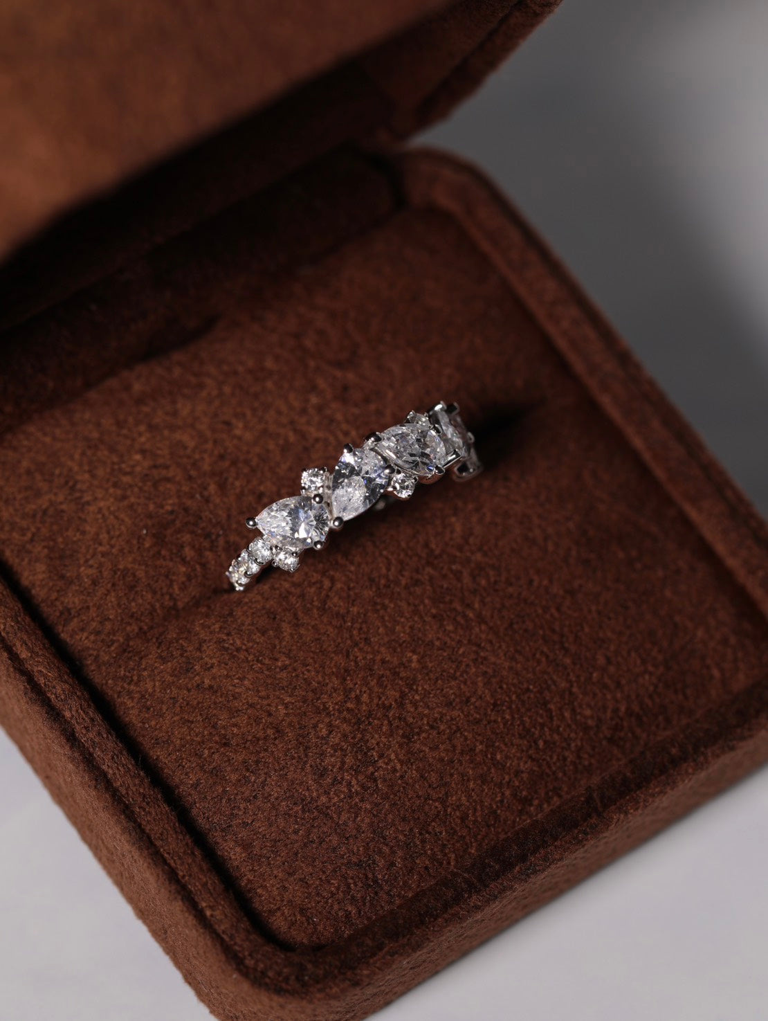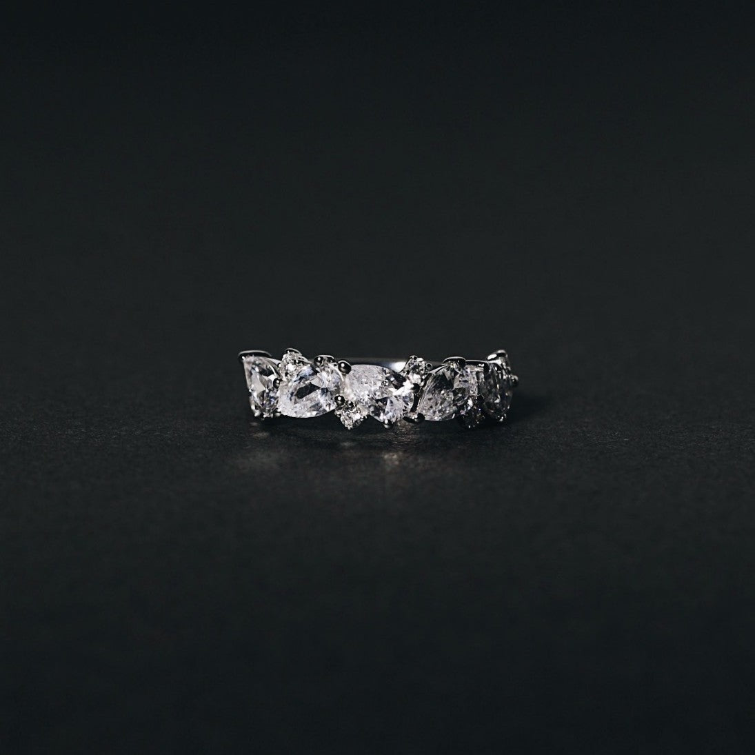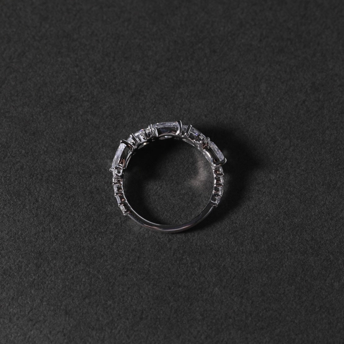 洗練されたペアシェイプのダイヤモンドが、指をぐるりと半周にわたって連なる“ハーフエタニティ”デザイン。