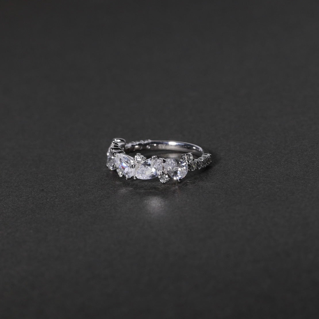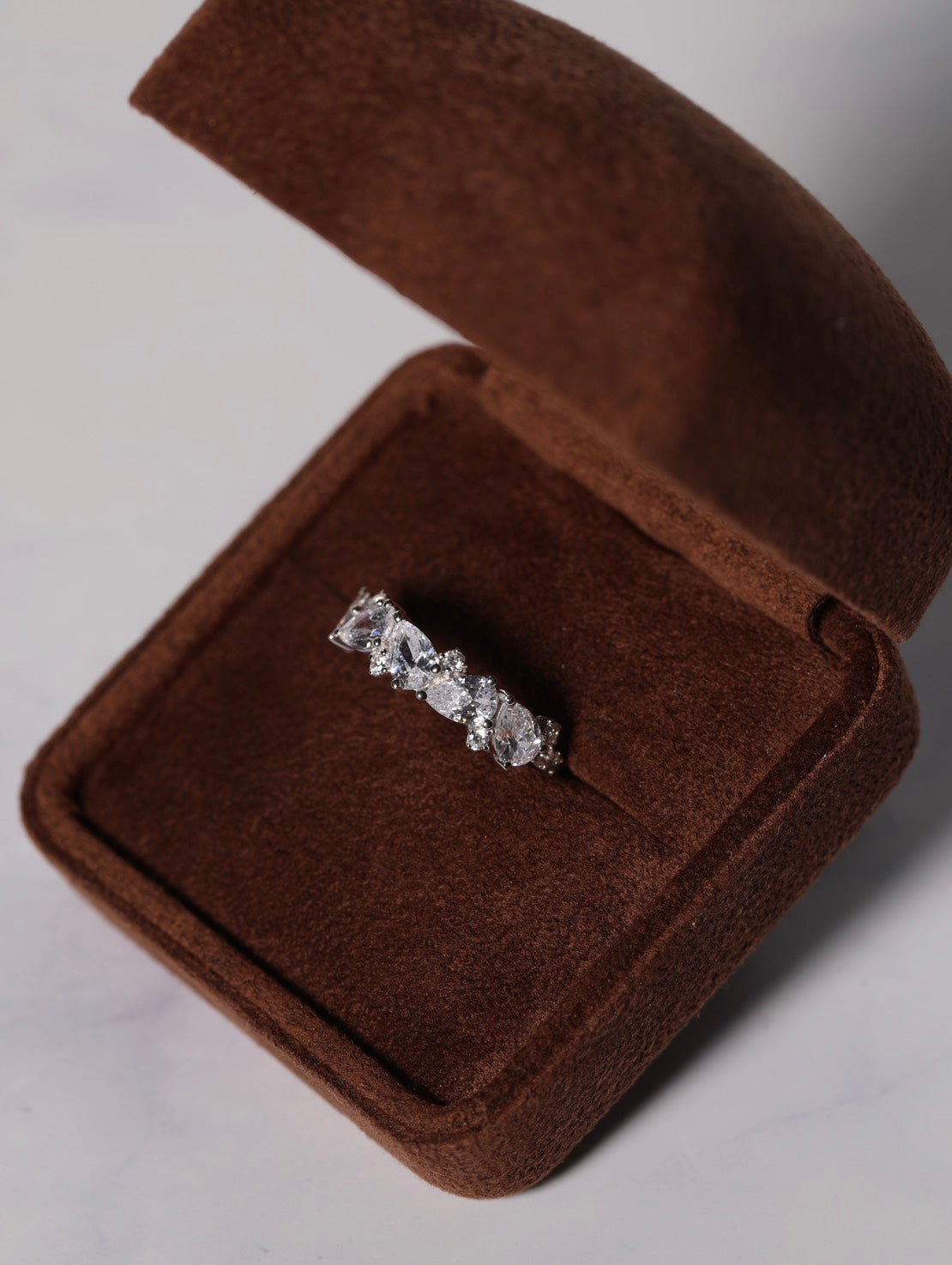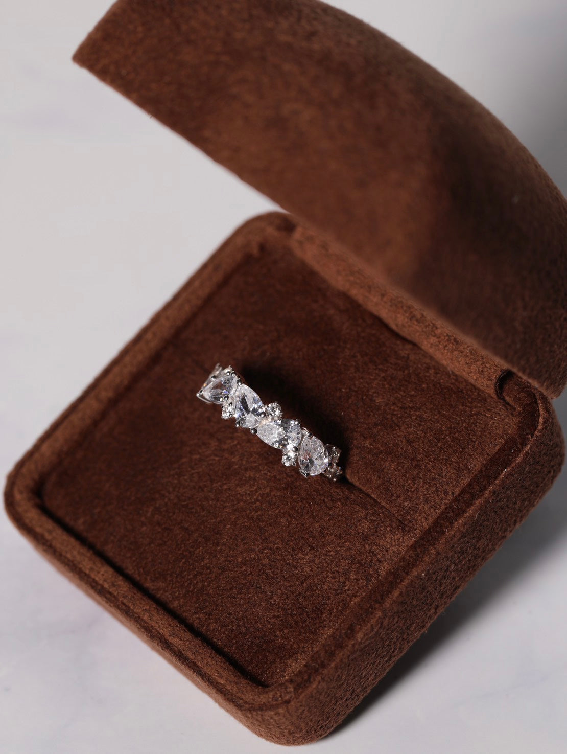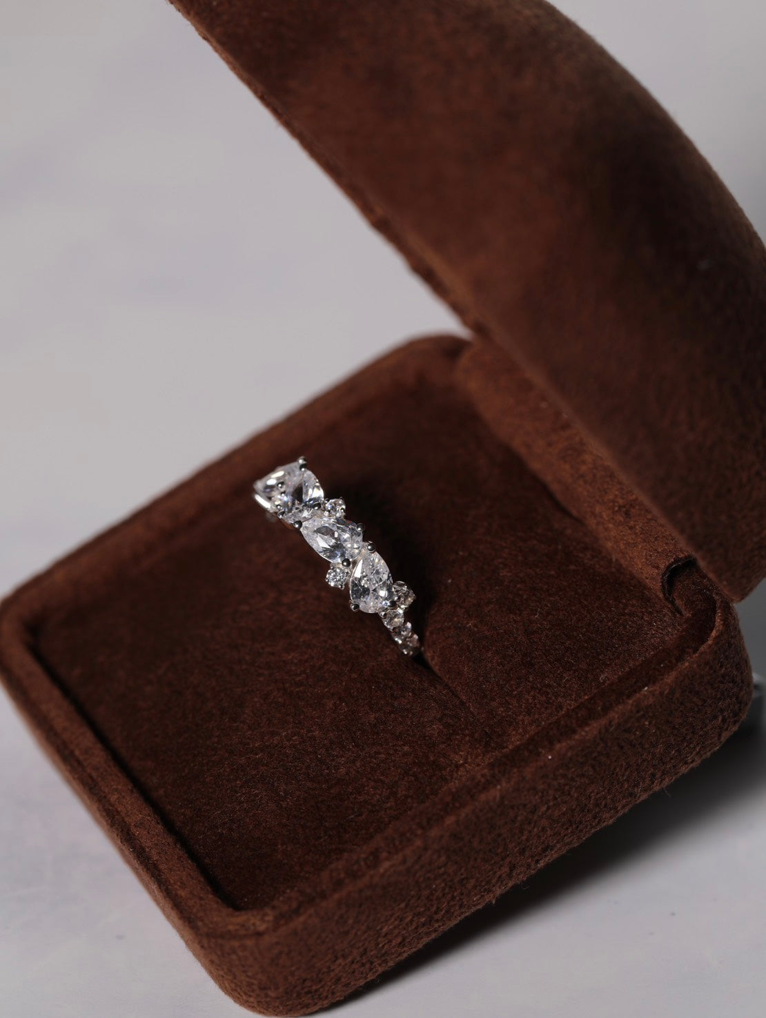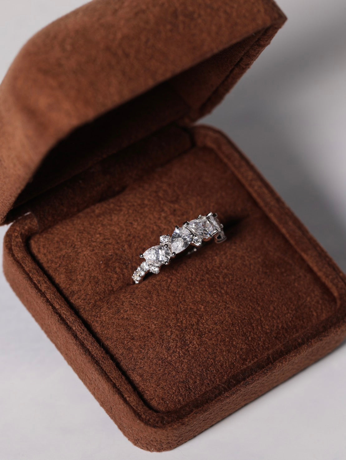洗練されたペアシェイプのダイヤモンドが、指をぐるりと半周にわたって連なる“ハーフエタニティ”デザイン。