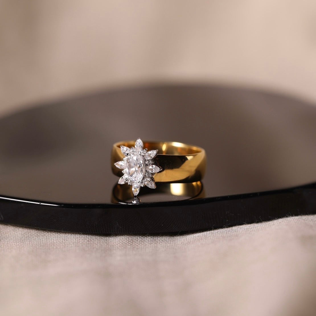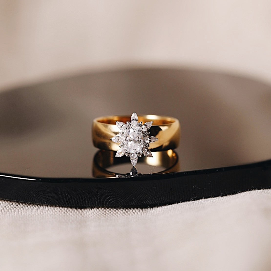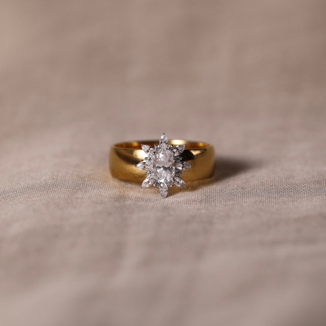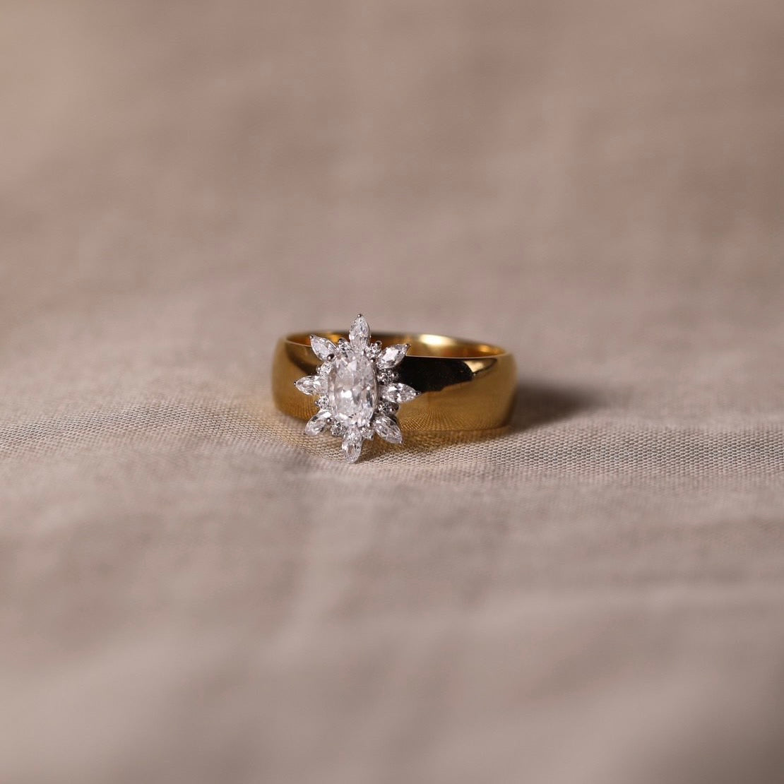 中心には上質なオーバルカットダイヤモンドを配置し、その両側をマーキスカットとラウンドカットのメレダイヤで囲む、贅沢で洗練された装いです。